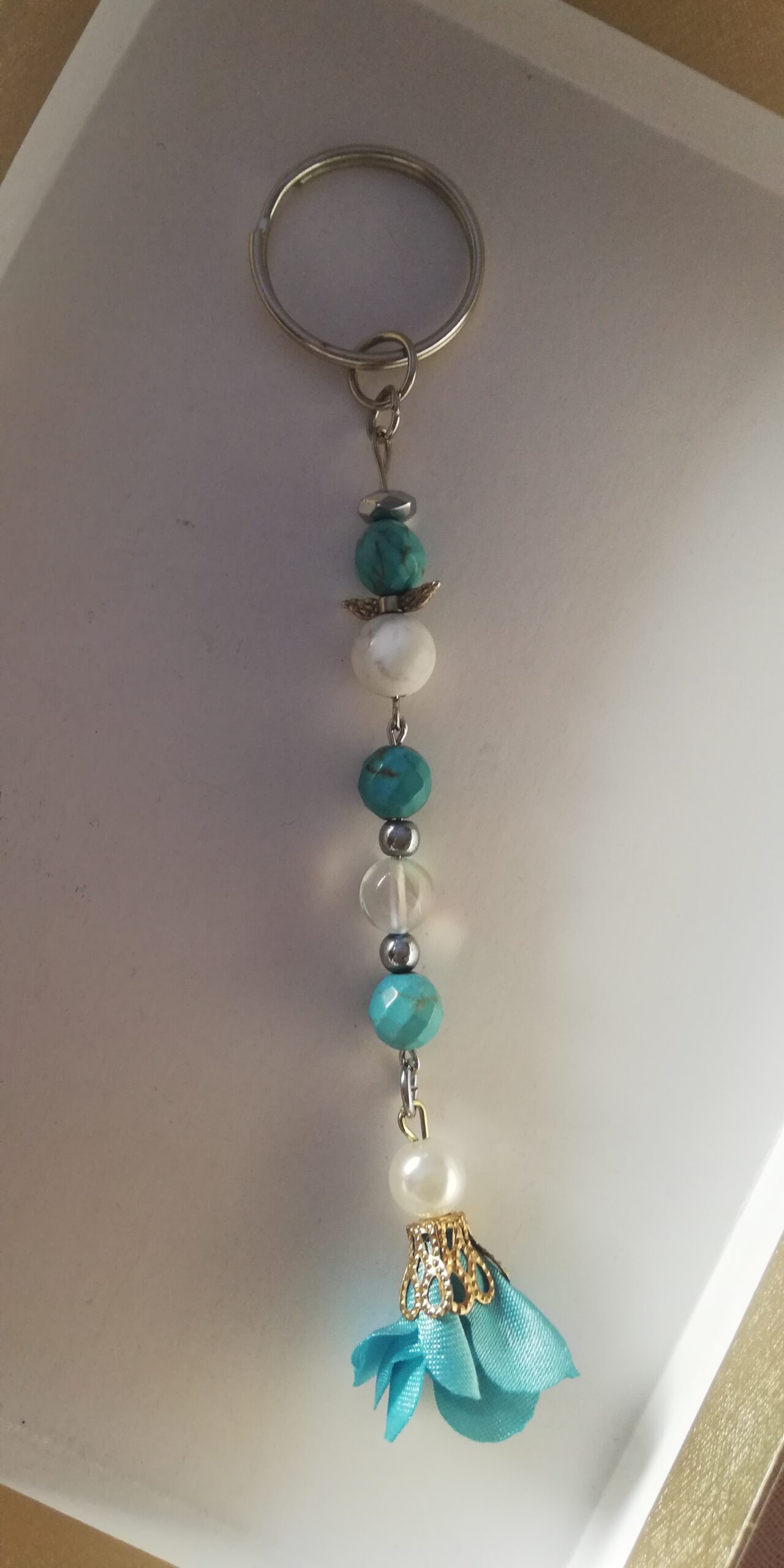 Gyöngyből, aura kvarcból és howlitból készült kulcstartó