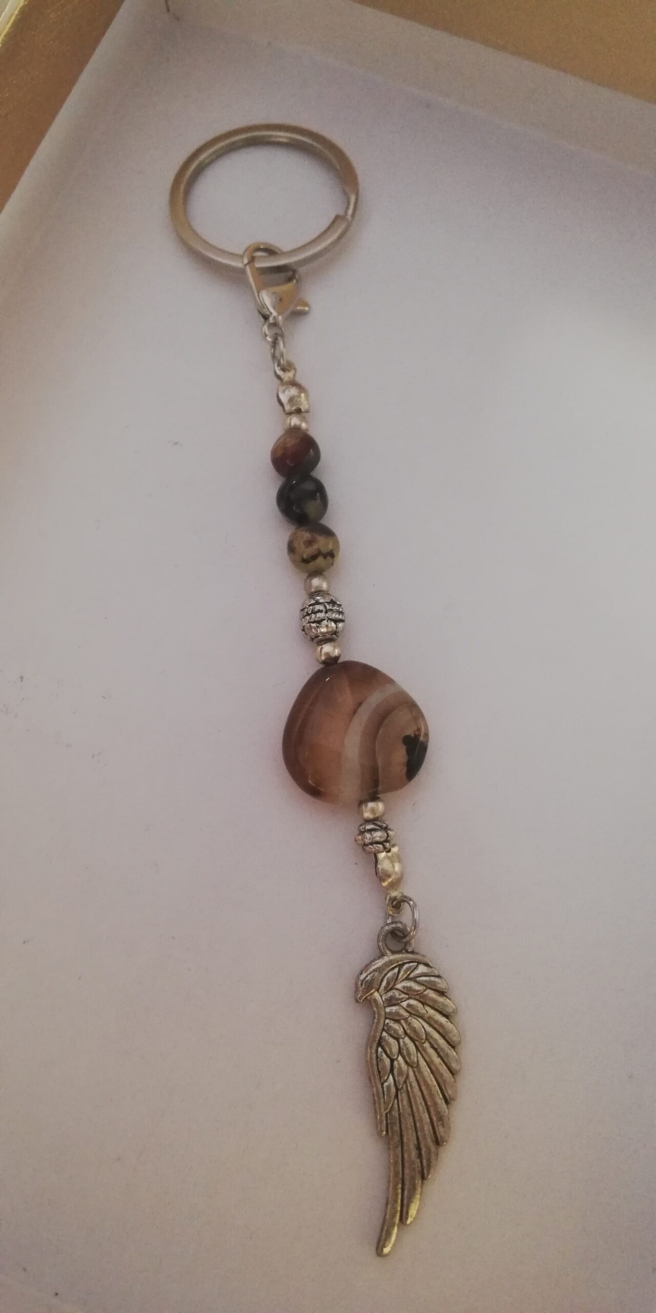 Achátból készült kulcstartó, ,angyal szárnnyal díszítve, amely mutatós dísz táskára, ruházatra is.