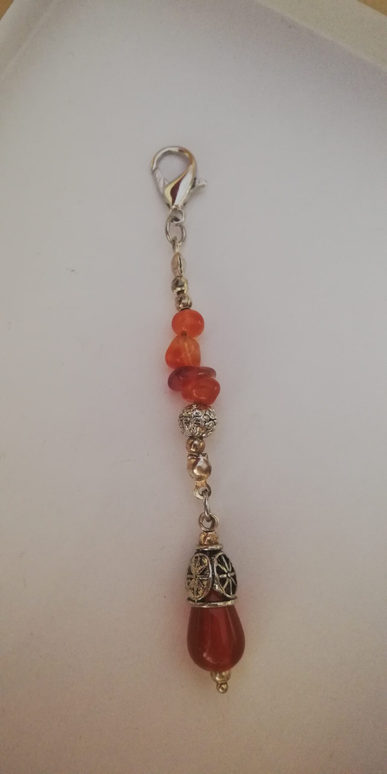 Karneolból készült cipzár dísz. Mutatós dísz táskára, ruházatra.