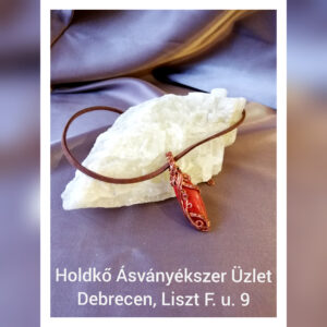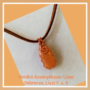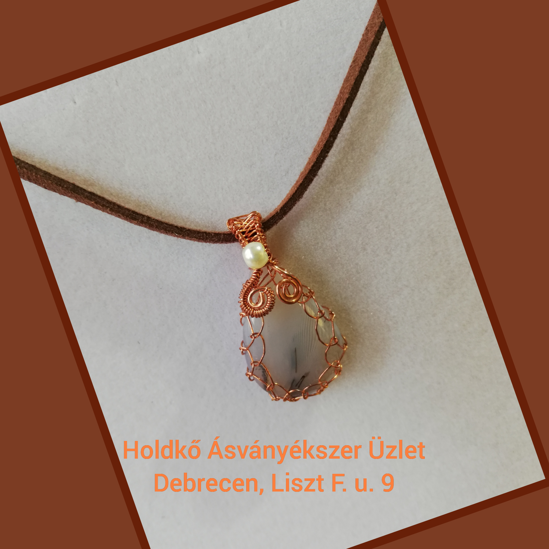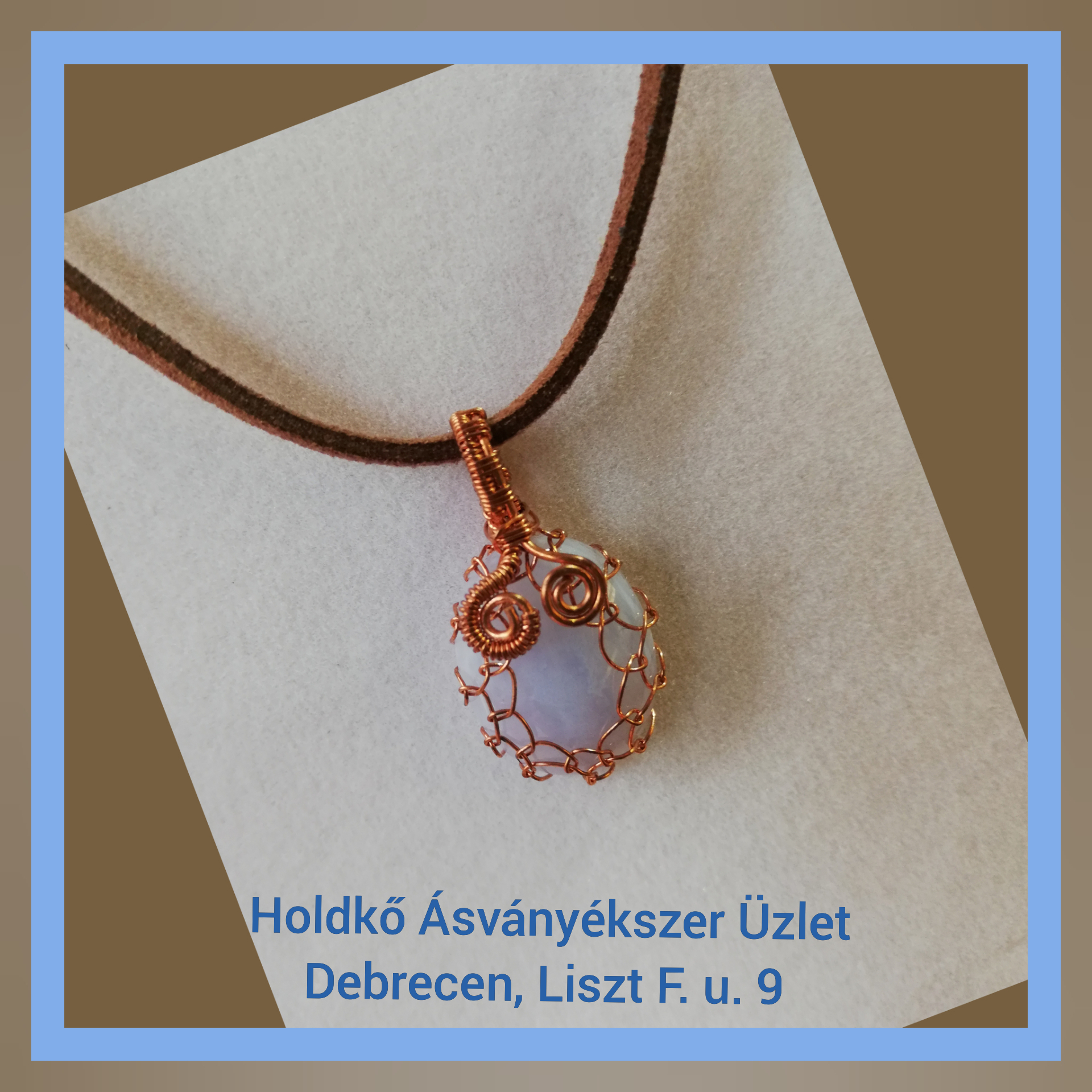 Rézdrót foglalatban holdkő medál bőrszálon. Hossz.:48 cm