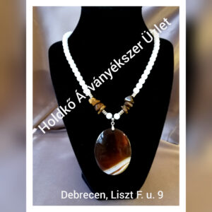 Ovális, barna sávos achát medál, fehér achát és törtszemes tigrisszemes láncon. T-kapcsos, 43 cm hosszú.