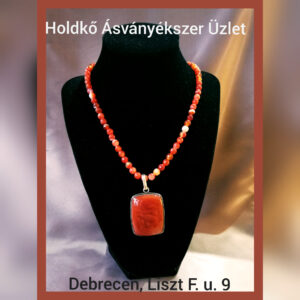 Szögletes, fémfoglalatos , levehető karneol medál, karneolos achát láncon. A nyaklánc 44 cm hosszú, virág kapcsos.