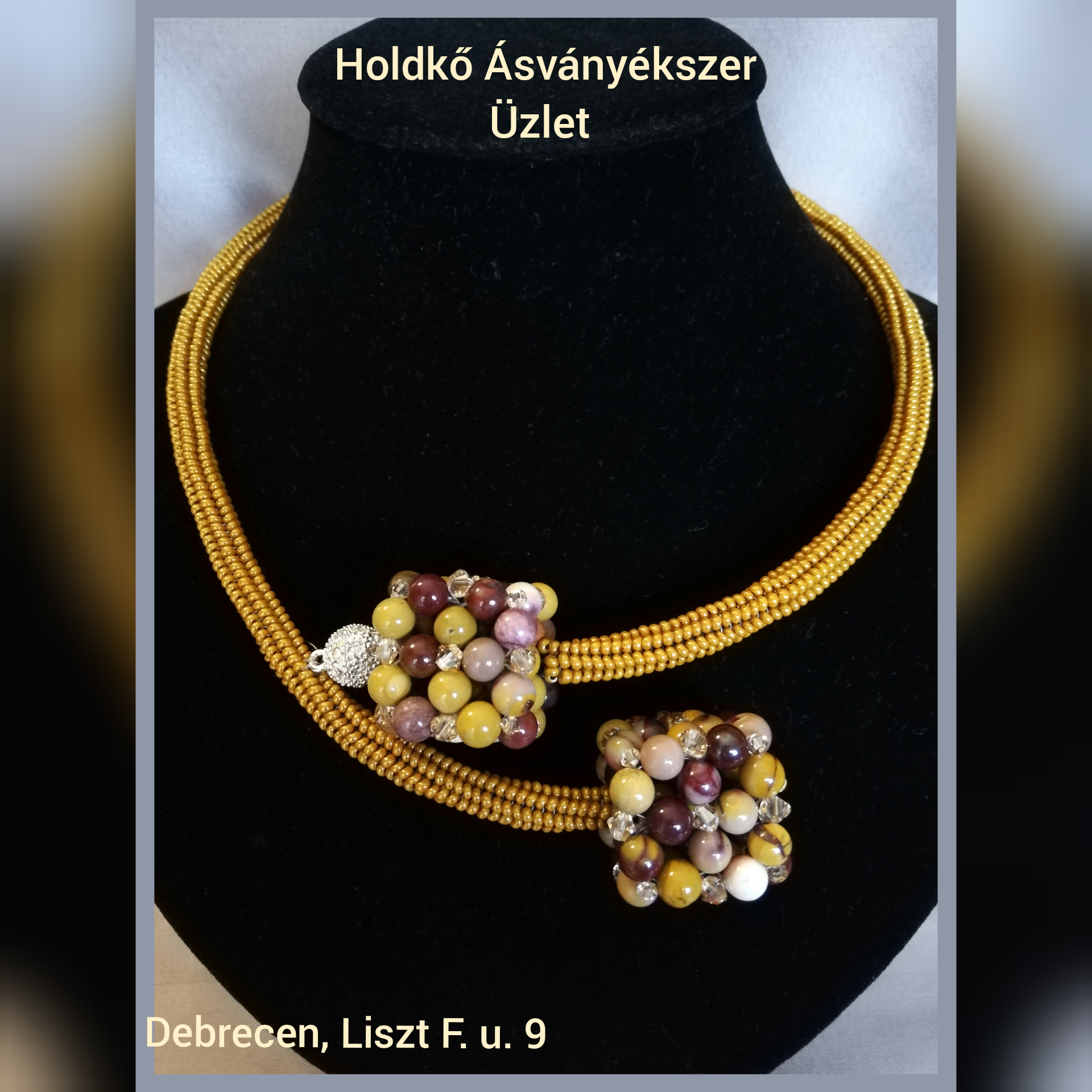 Egyedi megoldással készült nyaklánc mookaitból és swarovszki kristályból. A lánc rész merev, sárga gyöngyökből van fűzve.
