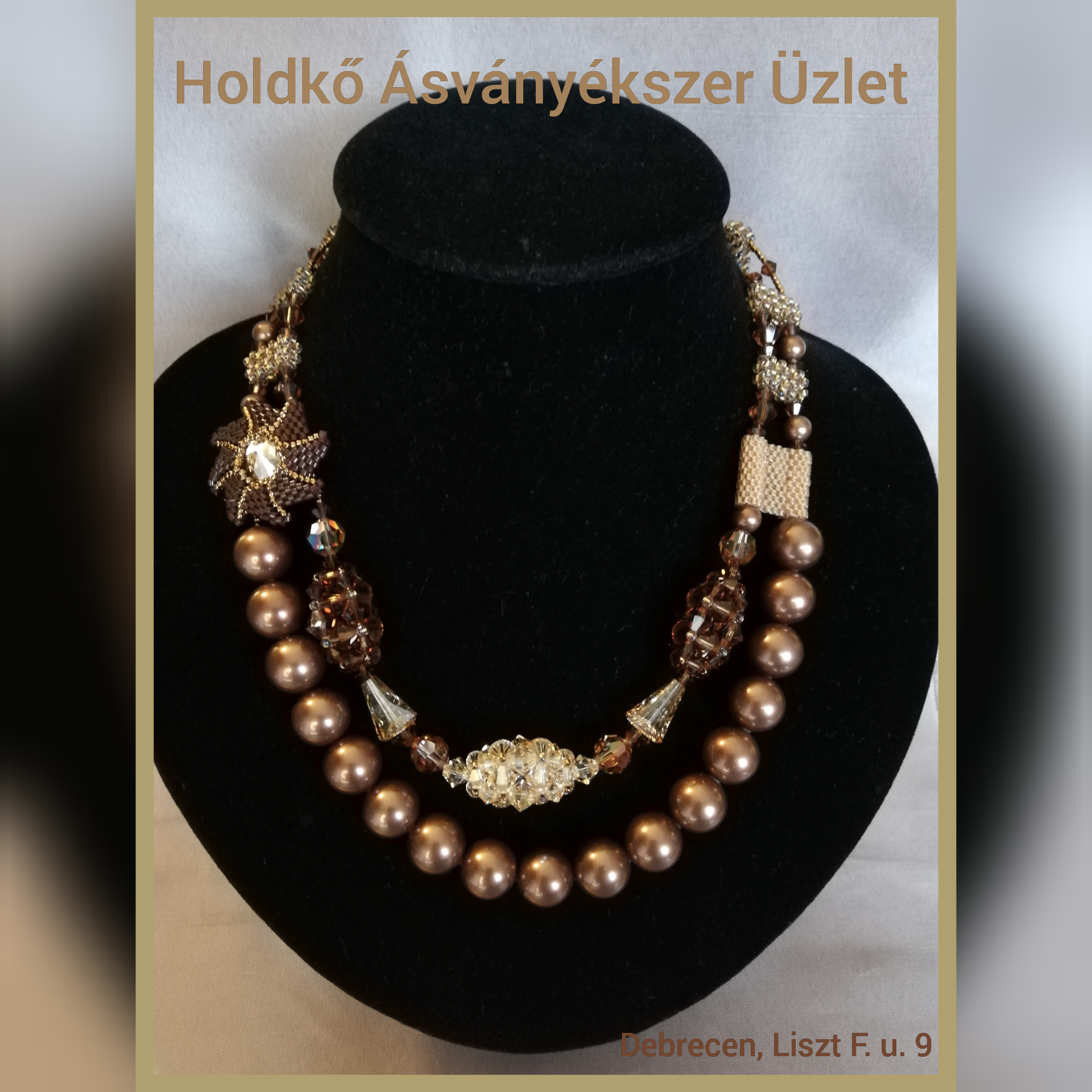 Finom eleganciát tükröz ez a barna színű swarovszki kristályból, japán üveggyöngyből és kagyló gyöngyből készült nyaklánc. Hossza: 44 cm.