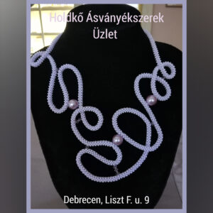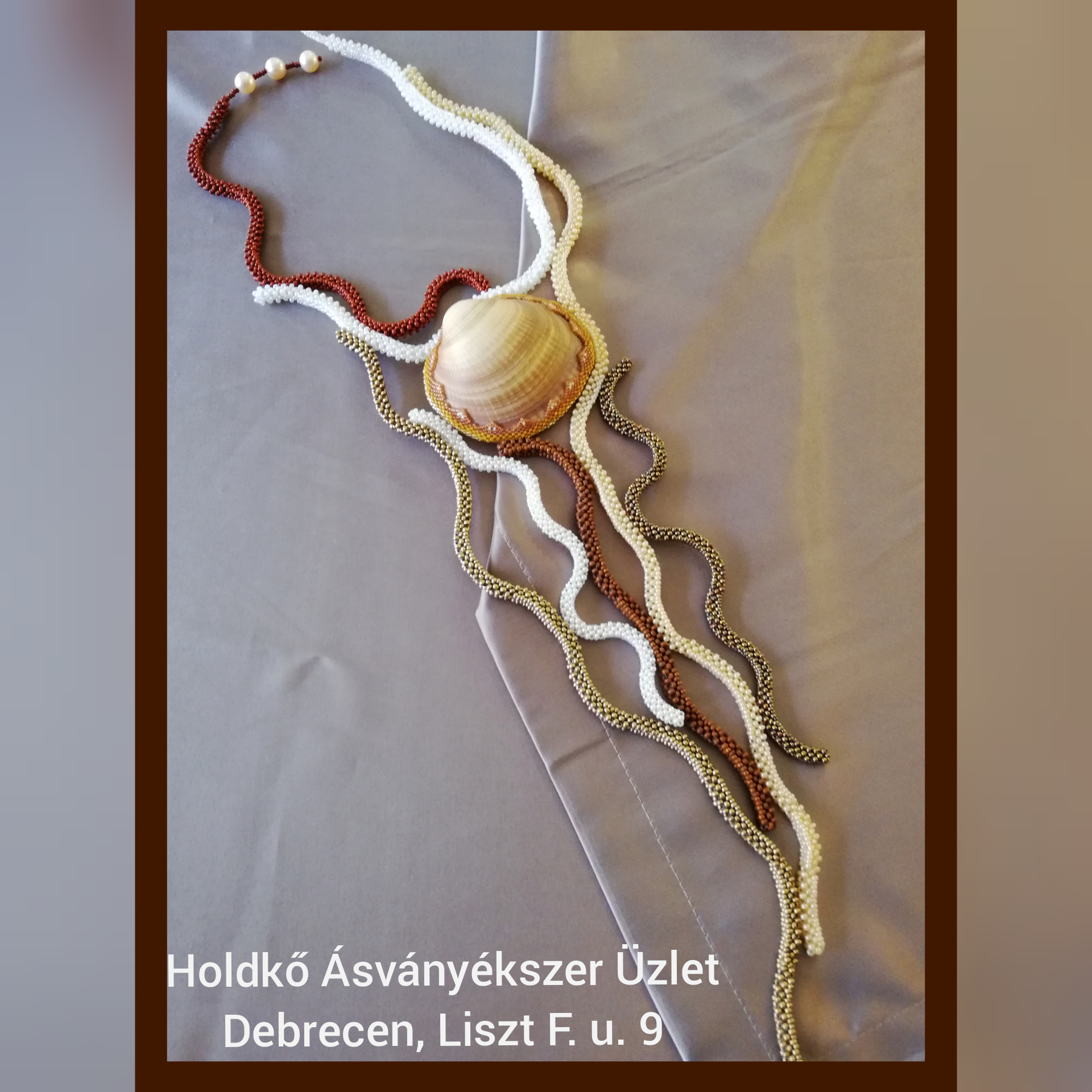 A tenger hullámait szimbolizáló különleges megoldású merev nyaklánc kagylóval és édesvízi tenyésztett gyönggyel. A méret állítható 44 cm-től 48 cm-ig. A nyaktól számított hossz: 50 cm