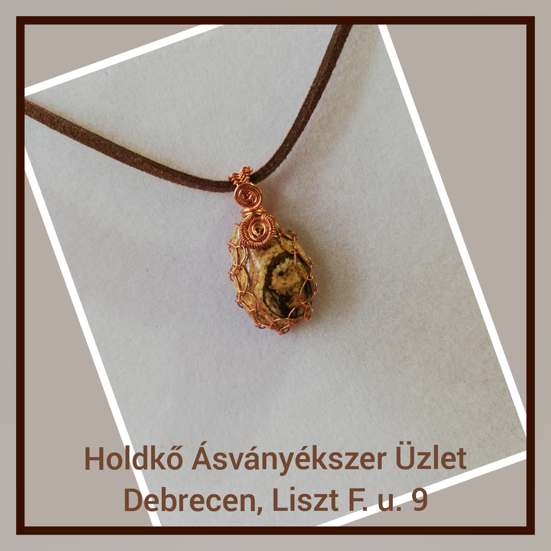 Rézdrót foglalatban képjáspis medál bőrszálon. Hossz: 48 cm.