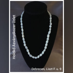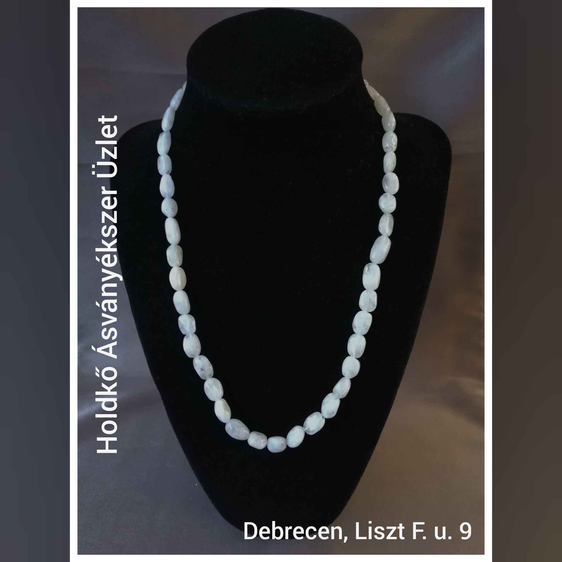 Kissé szabálytalan, ovális alakú fehér labradorit nyaklánc , 47 cm hosszú.