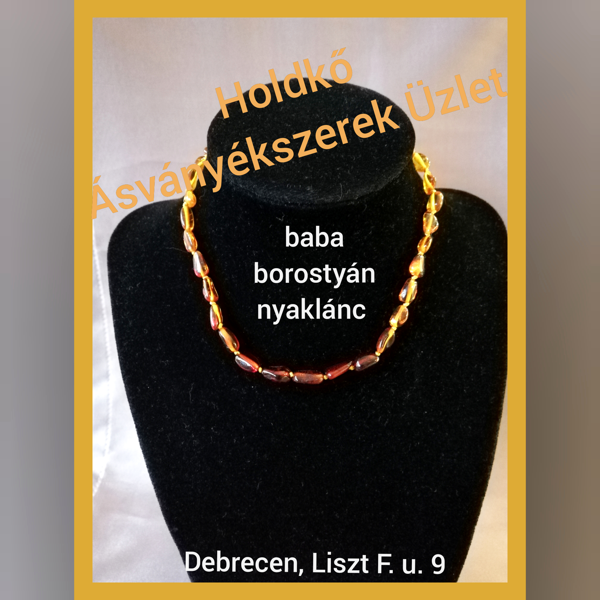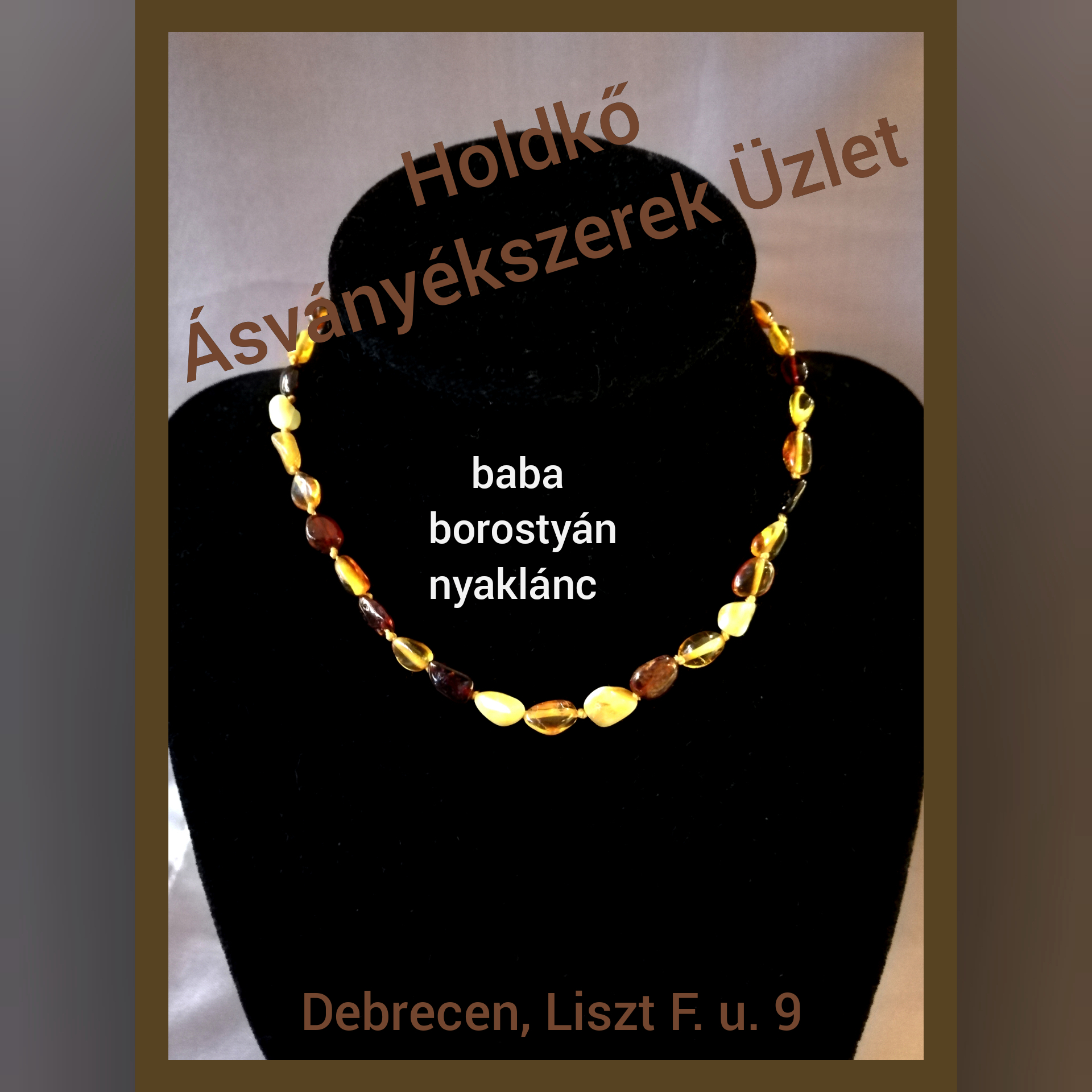5-7 mm-es szabálytalan, csiszolt borostyán szemekből készült a nyaklánc. Hossza: 32 cm A kapocs résznél a szemek borostyánnal fedett műanyag csavaros kapcsolóval illeszkednek. A nyaklánc különböző színű borostyán szemekből készült.