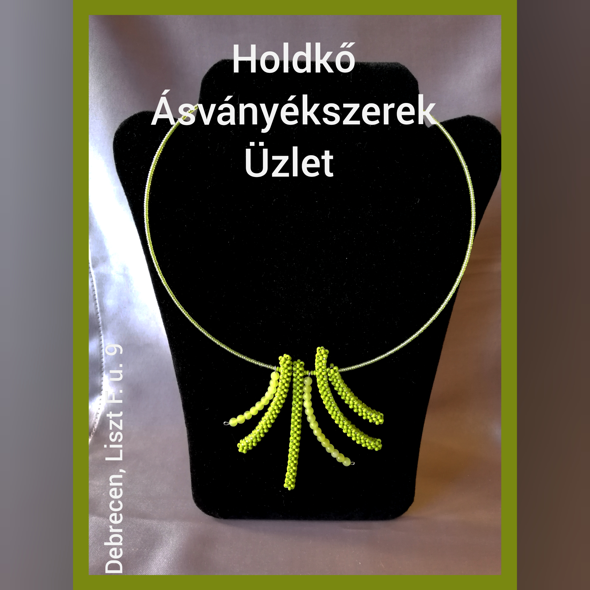 Egyedi tervezésű, jádéból és zöld gyöngyből készült merev nyaklánc. A weboldalon található hozzá fülbevaló.