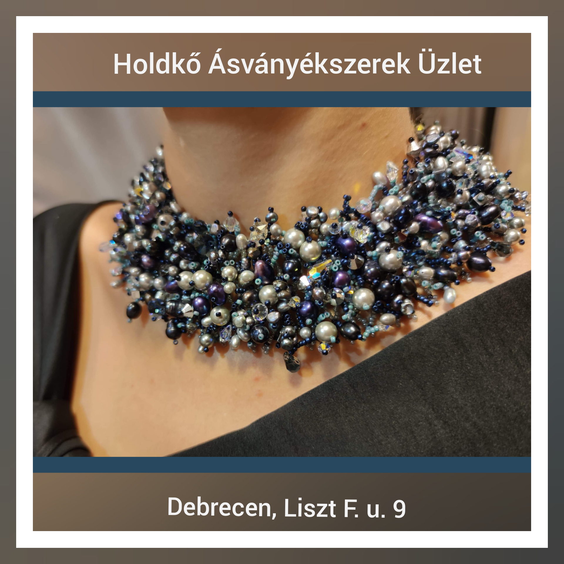 Az üzlet egyik legszebb és legelegánsabb darabja. Számtalan kék shell pearlből és számtalan swarovszki kristályból készült. Hossza: 40 cm