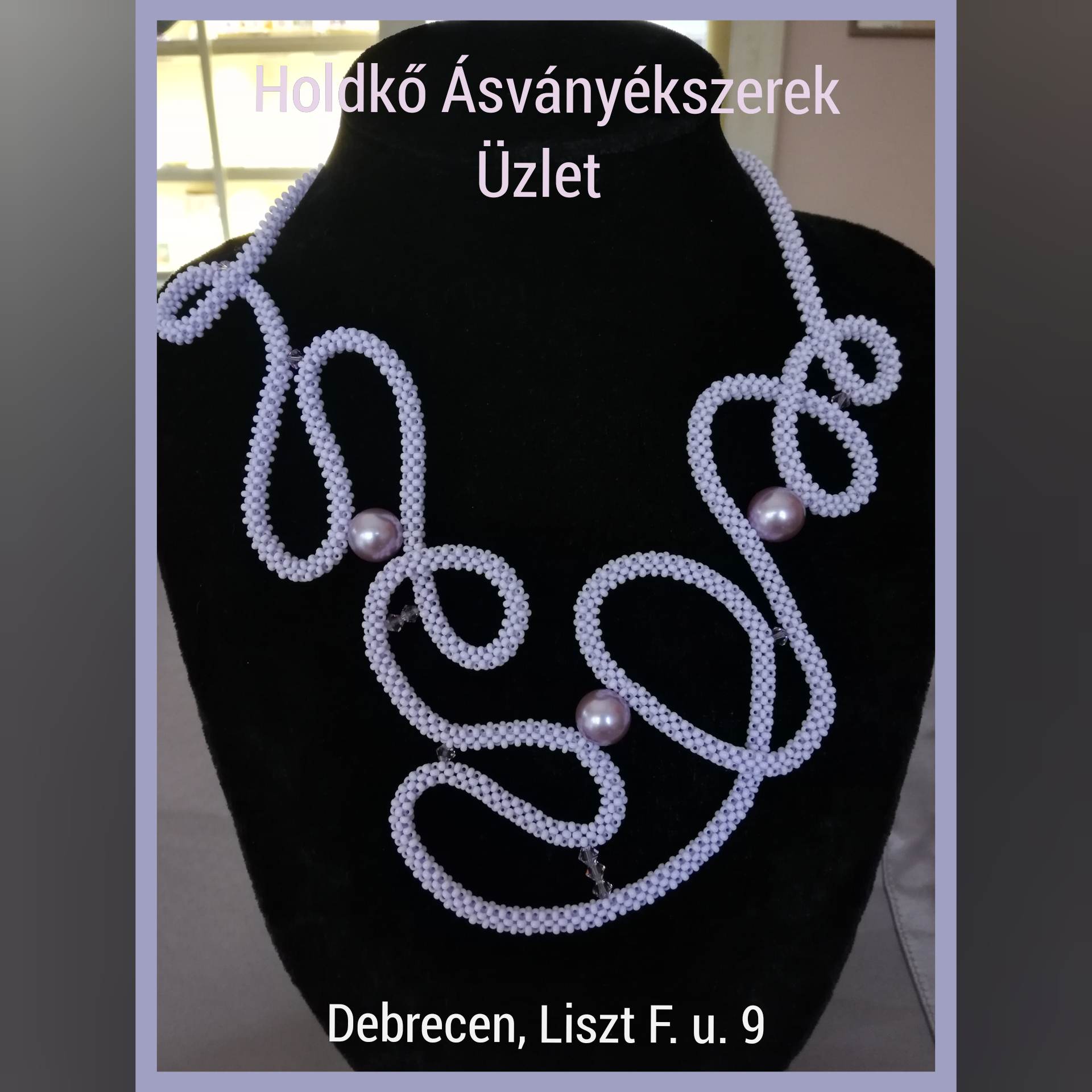 Halvány lila gyöngyökből és lila kagyló gyöngyből valamint lila swarovszki kristályból készült ez szép és különleges formájú nyaklánc.