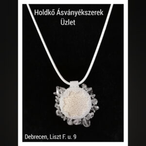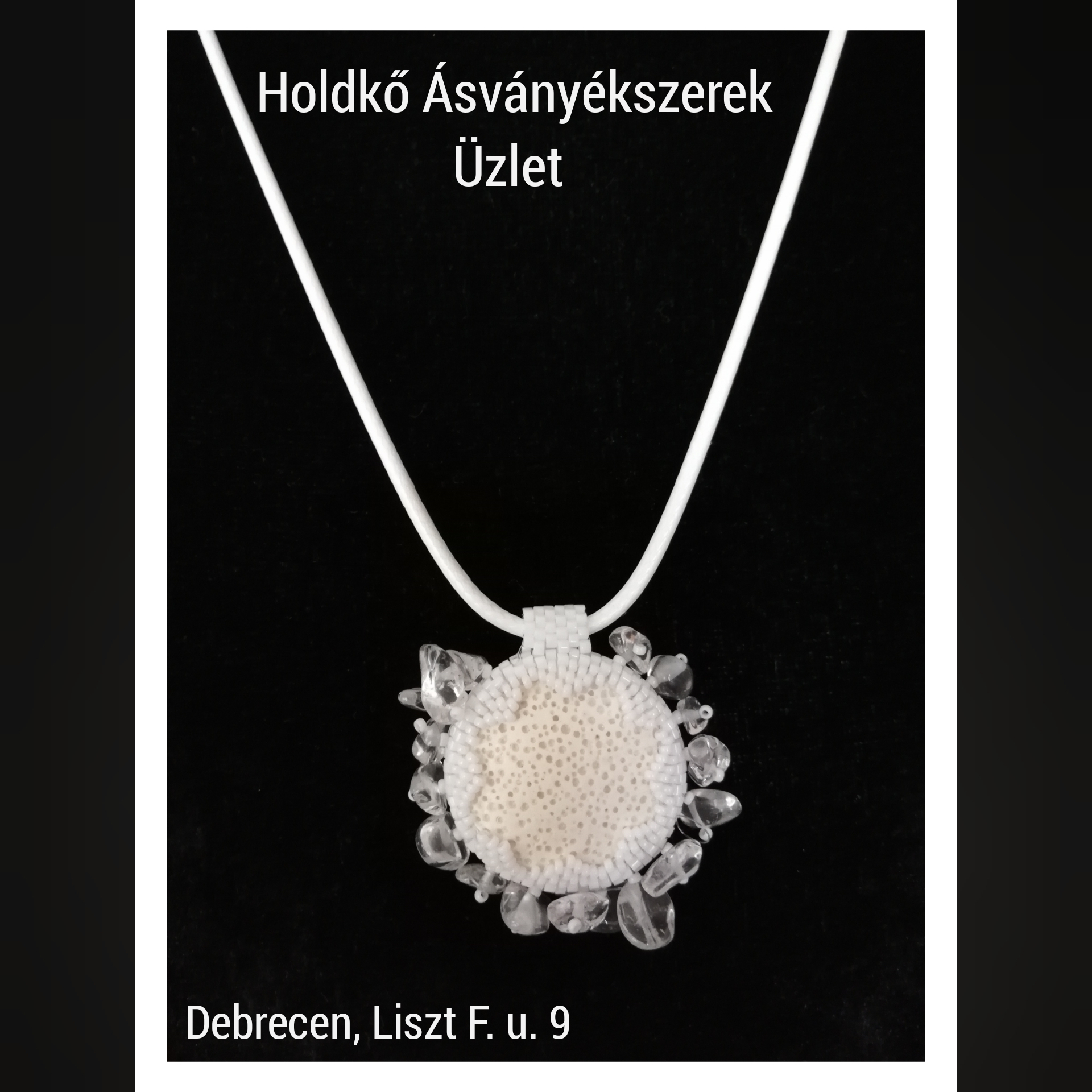 Fehér lávakő ( 3 cm ) medál fehér gyöngyökkel körbefűzve, törtszemes hegyikristállyal díszítve. A lánc rész impregnált zsinór. Hossza: 44 cm , lánchosszabbítós.