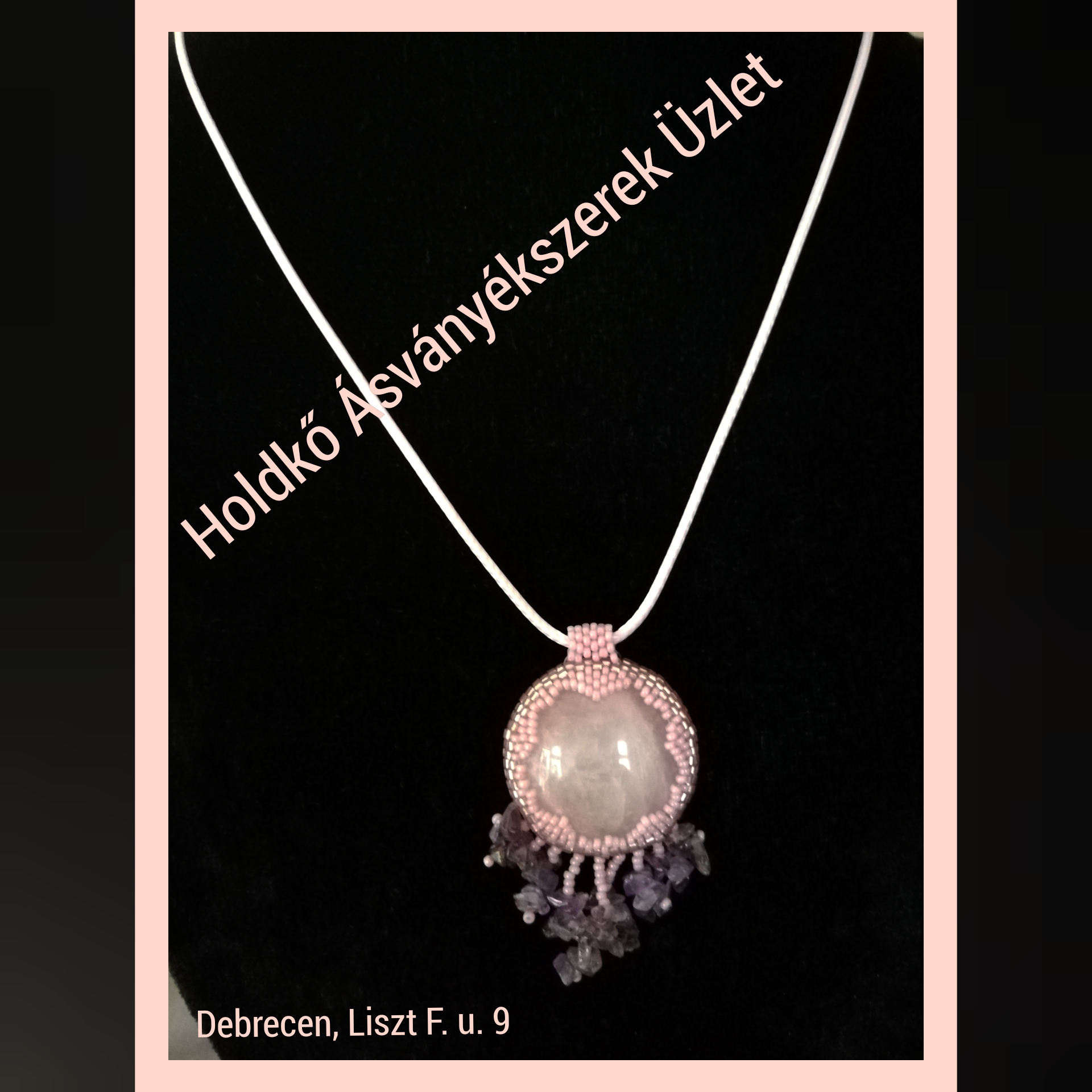 Rózsakvarc (2,5 cm) medál, rózsaszínű gyöngyökkel körbefűzve, törtszemes ametiszttel díszítve. A lánc rész impregnált zsinór. Hossza: 48 cm, lánchosszabbítós.