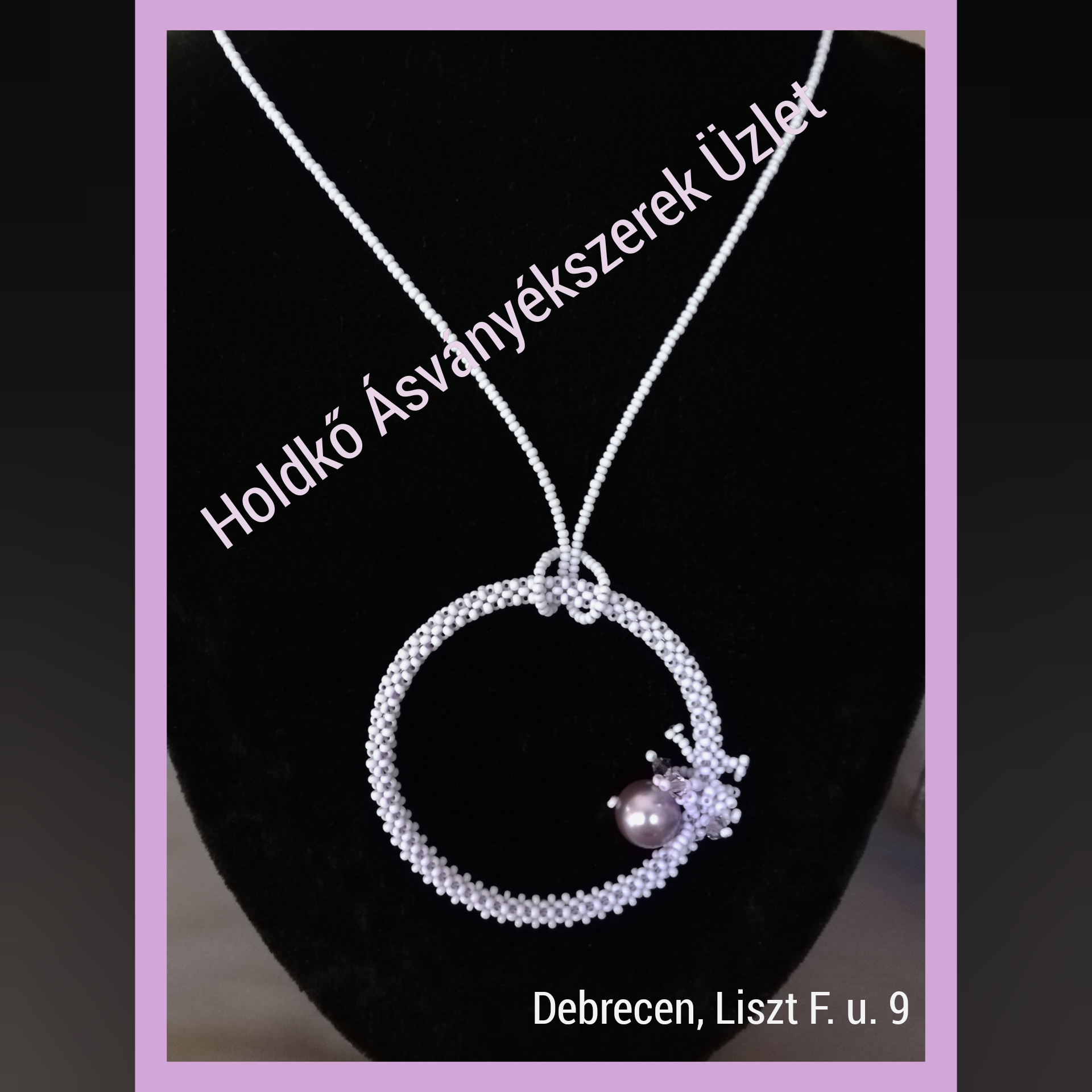 Hosszú (65 cm-es) lánc lila gyöngyökből készült. A medál rész 6 cm-es karika, halvány lila szinű gyöngyökkel körbefűzve, lila kagyló gyönggyel és lila swarovszki kristállyal díszítve.