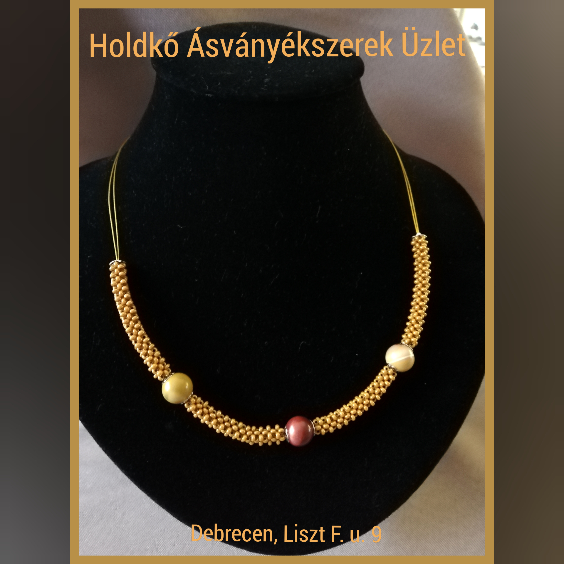 A nyaklánc mookait golyókból és mustársárga gyöngyökből készült. Hossza: 50 cm, lánchosszabbítós.