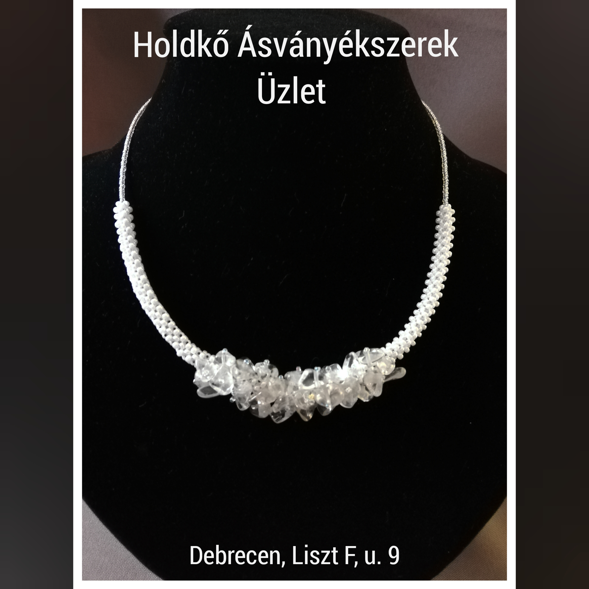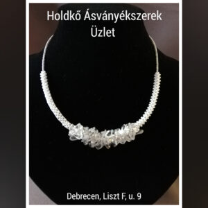 Törtszemes hegyikristályból és fehér gyöngyből készült a nyaklánc. Hossza: 43 cm, lánchosszabbítós.