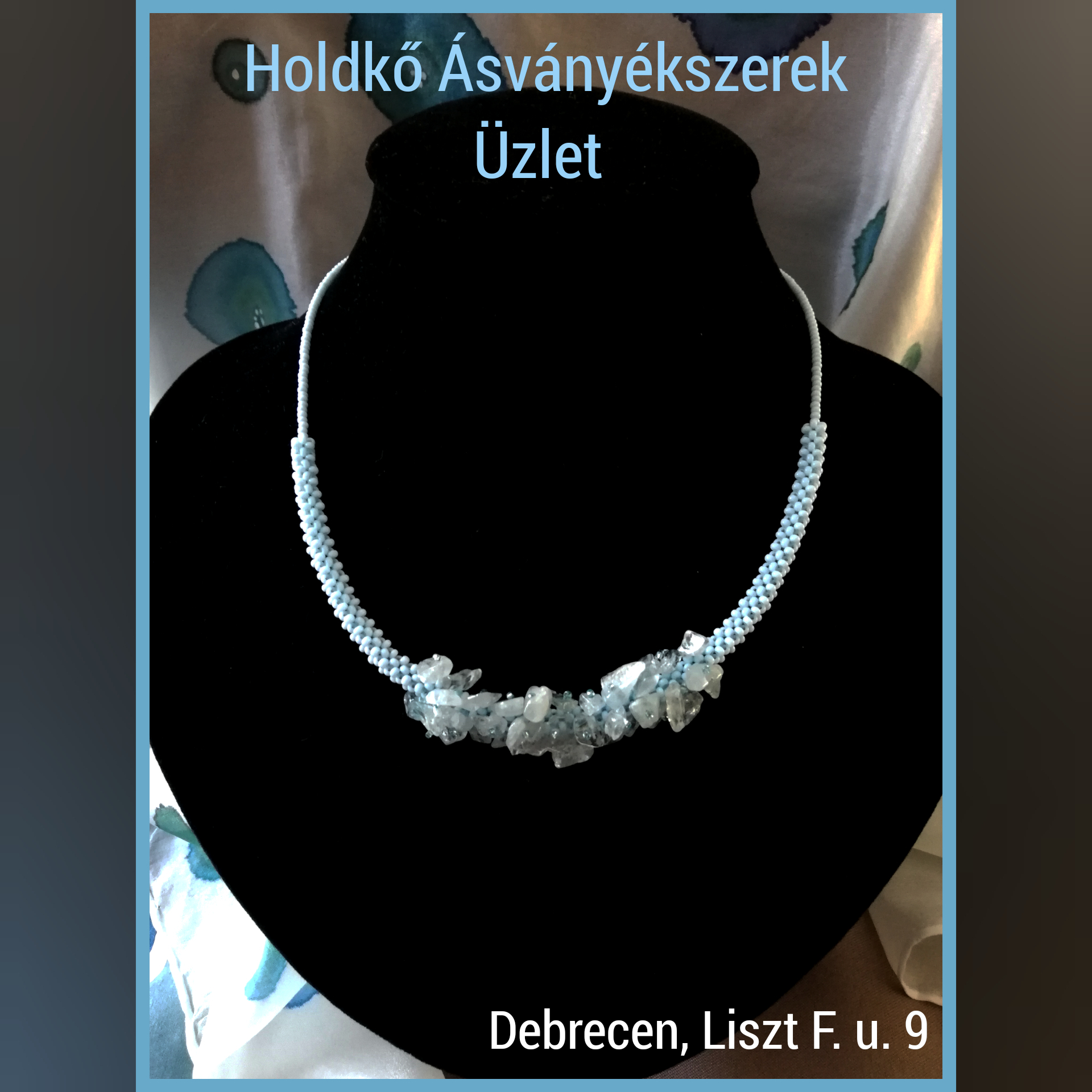 Törtszemes akvamarinból és kék gyöngyből készült a nyaklánc. Hossza: 43 cm, lánchosszabbítós.