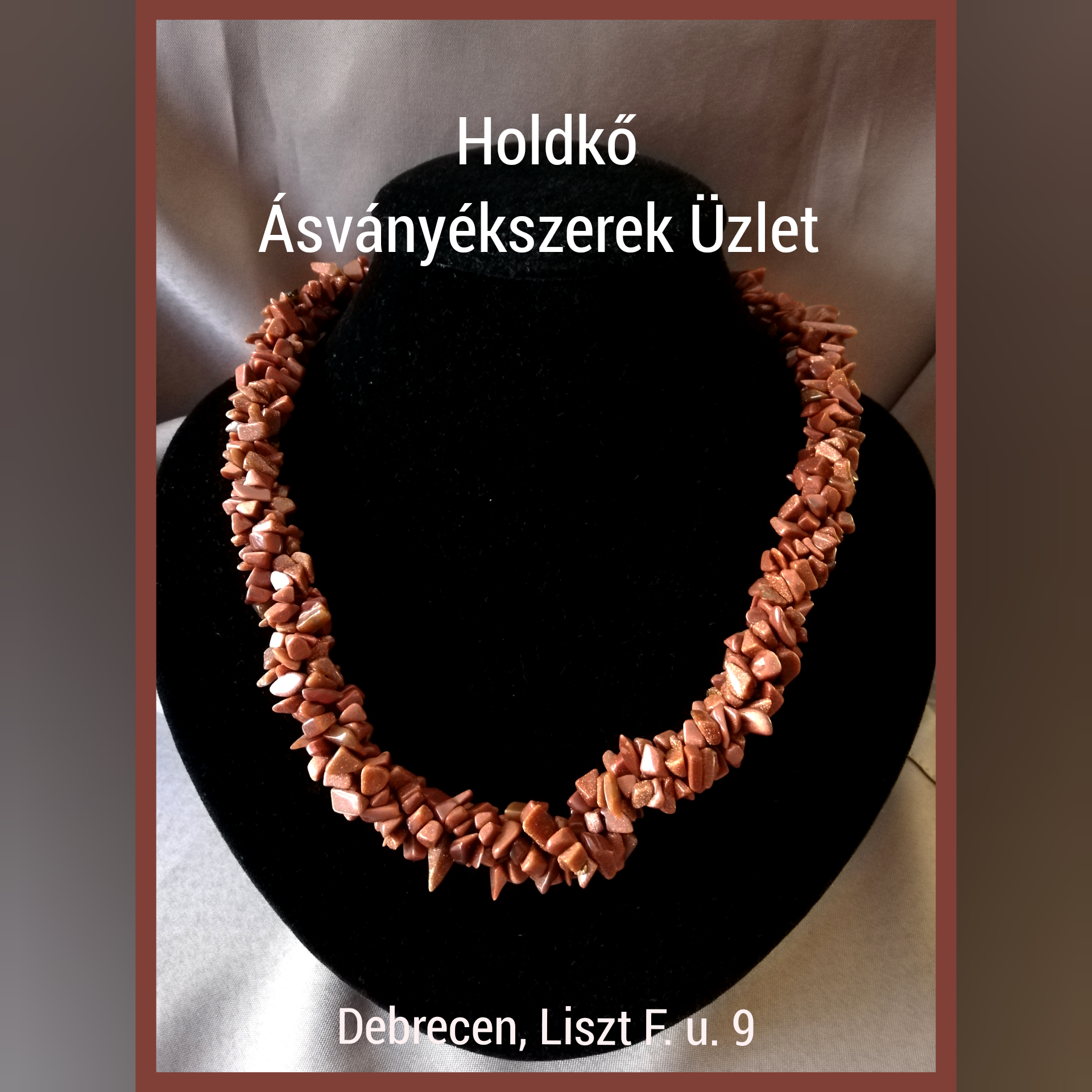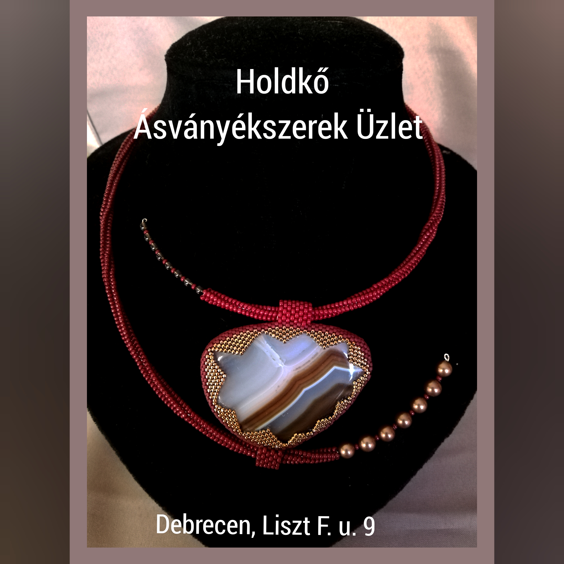 A medál rész achát lap (5,5 cm-es), amely barna és aranybarna gyöngyökkel van körbefűzve. A lánc rész merev, mély bordó-barna színű, füstkvarc golyók és barna shell pearl díszíti.
