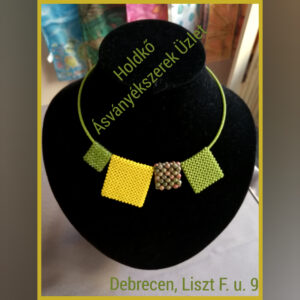 A medálok 2,2 x 2,2 cm unakitból , 3,8 x 3,8 cm sárga gyöngyből, 2 x 2 cm világos zöld üveggyöngyből, 3 x 3 cm zöld gyöngyből készült. A lánc rész merev, zöld gyöngyökkel van körbefűzve.