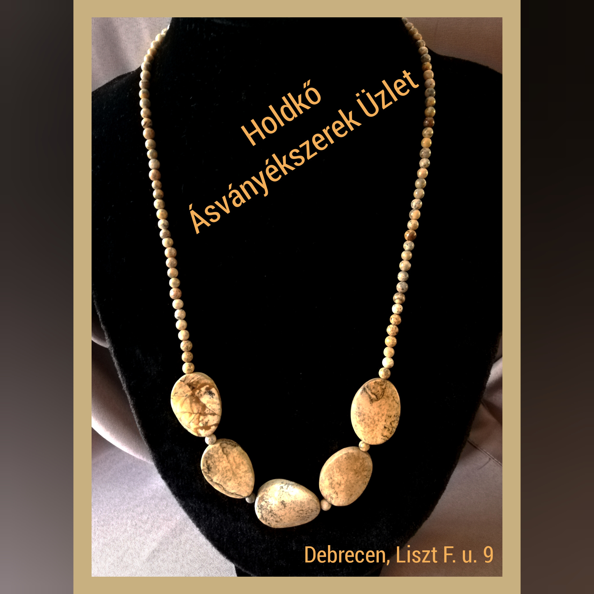 A lánc rész 4 mm-es képjáspis golyóból készült, középen 5 db 2,5 cm-es, ovális alakú képjáspis található. A nyaklánc hossza: 57 cm.