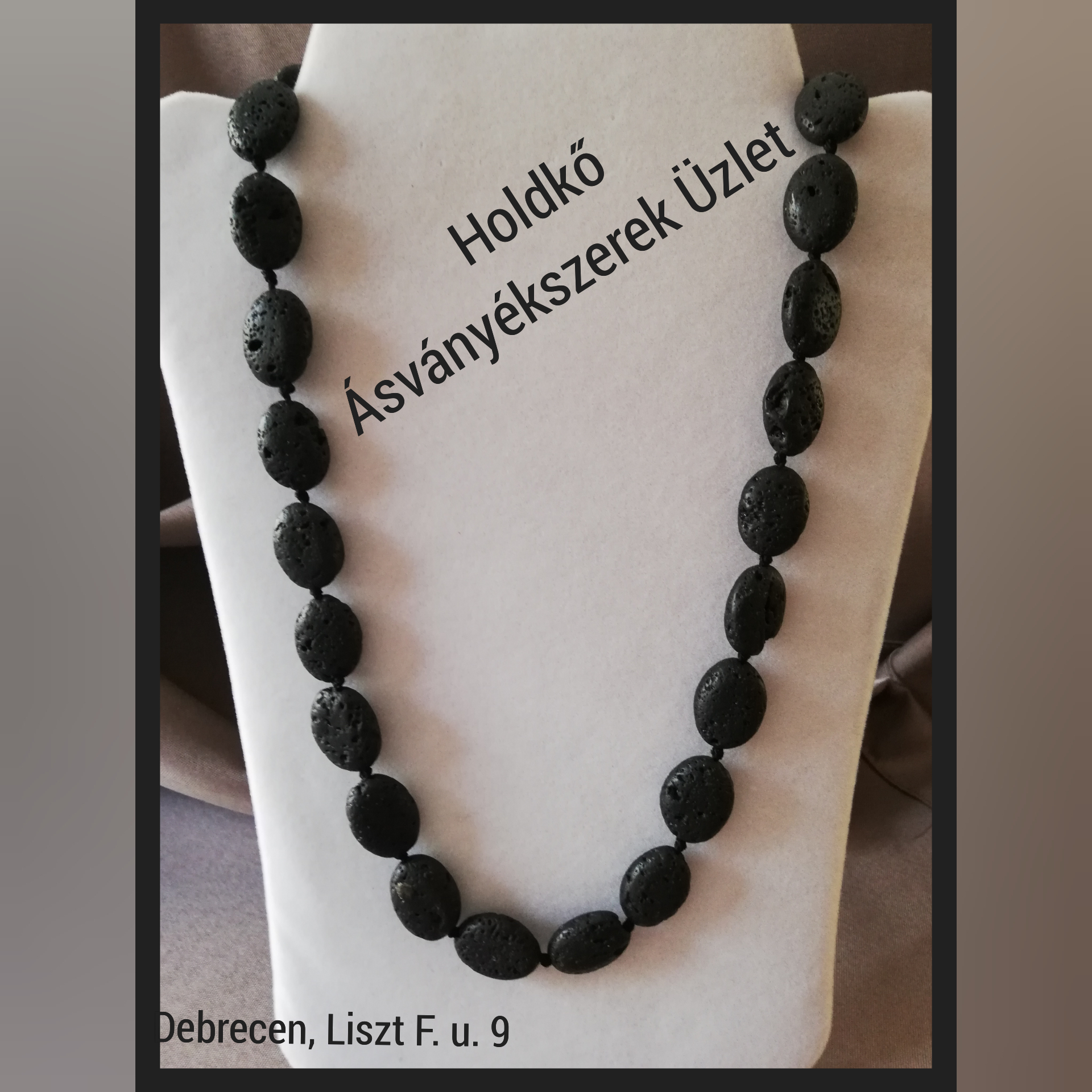 Fekete, 1,5 cm-es, ovális lávakövekből készült, csomózott nyaklánc. Hossza: 50 cm.