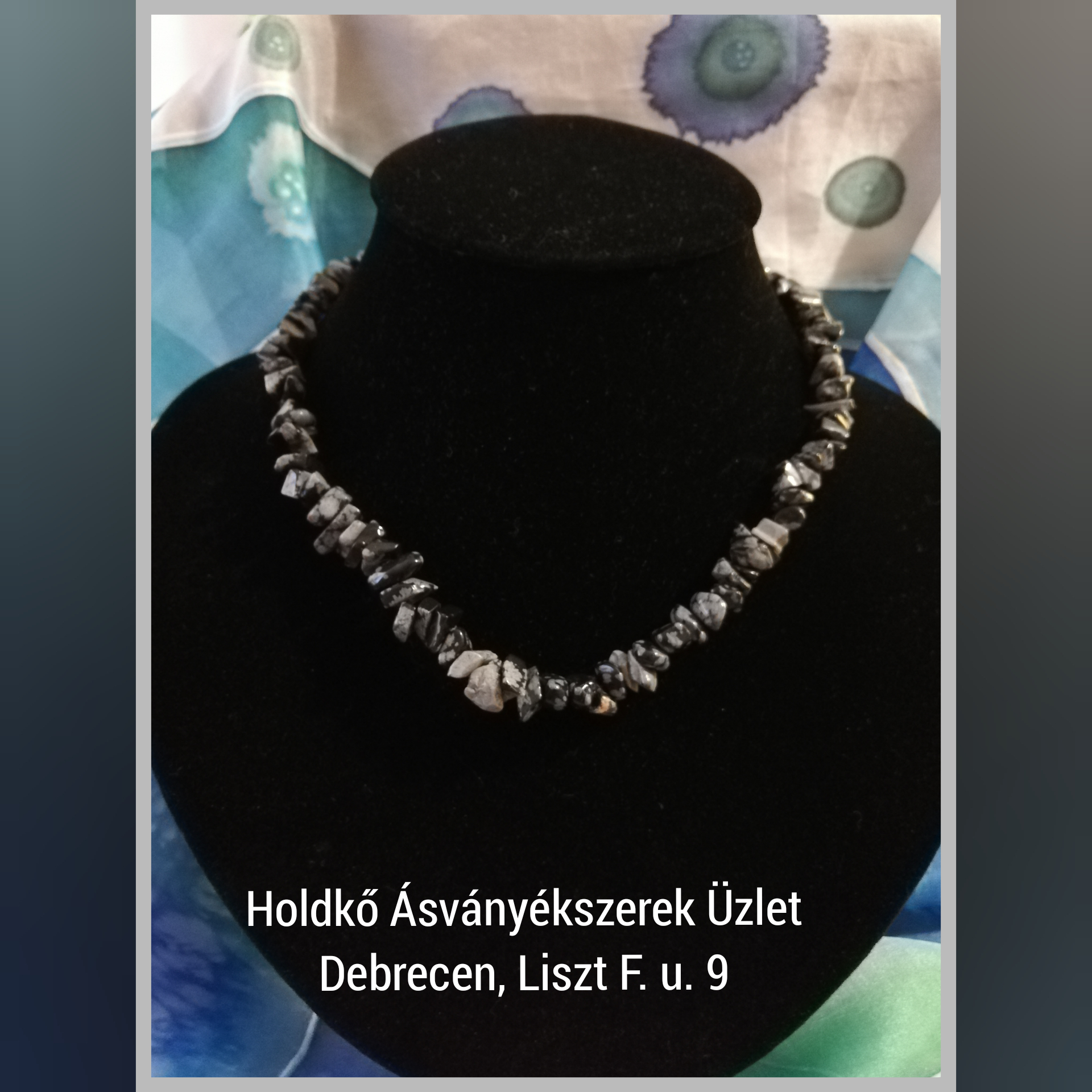 Törtszemes hópehely obszidiánból készült a nyaklánc, lánchosszabbítóval. Hossza: 36 cm.