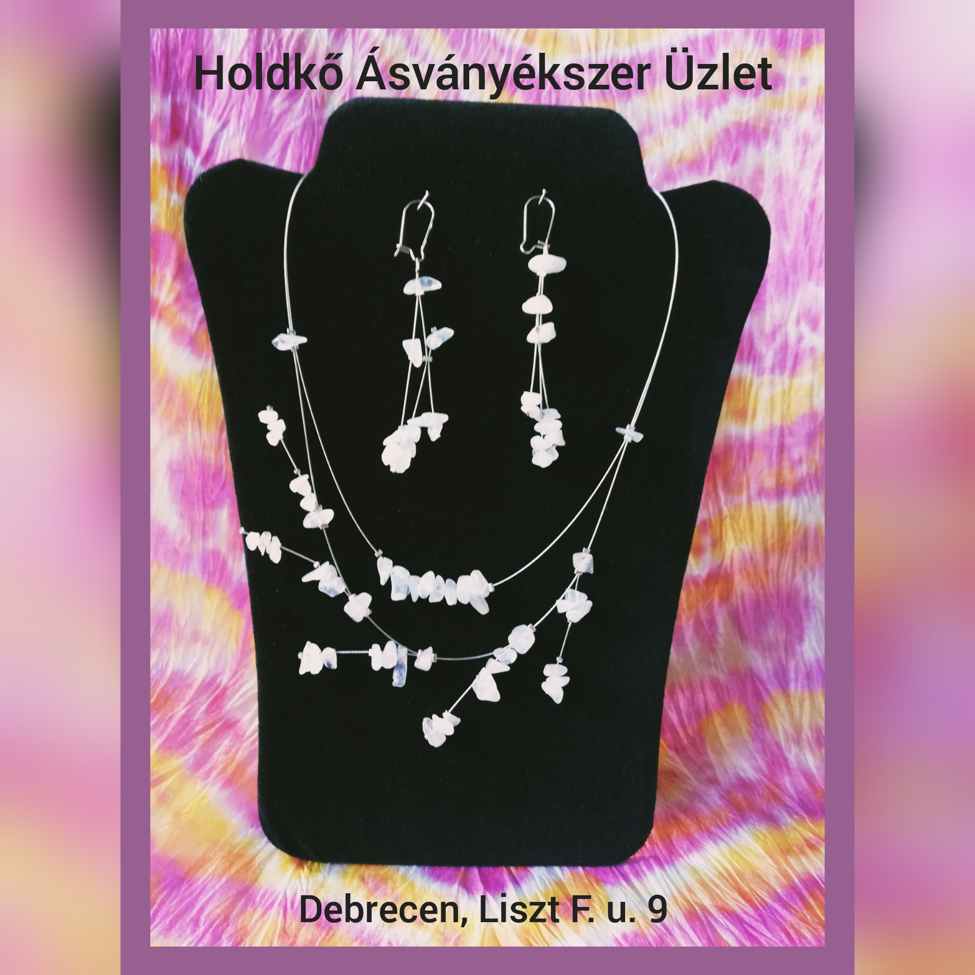 Különleges formájú, fazettált perui opálból készült a szett. A nyaklánc láncból és medálból áll, így a medál cserélhető , a fülbevaló francia kapcsos. A szett darabonként is megvásárolható.
