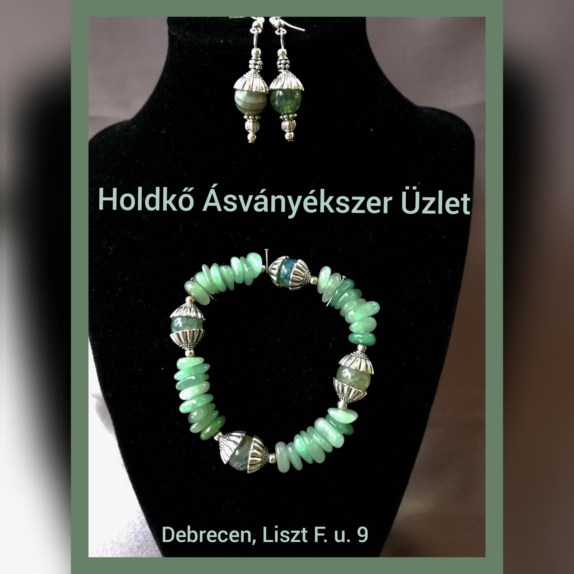 A szett aventurin és achát karkötőből és achát fülbevalóból áll. A szett darabonként is megvásárolható.