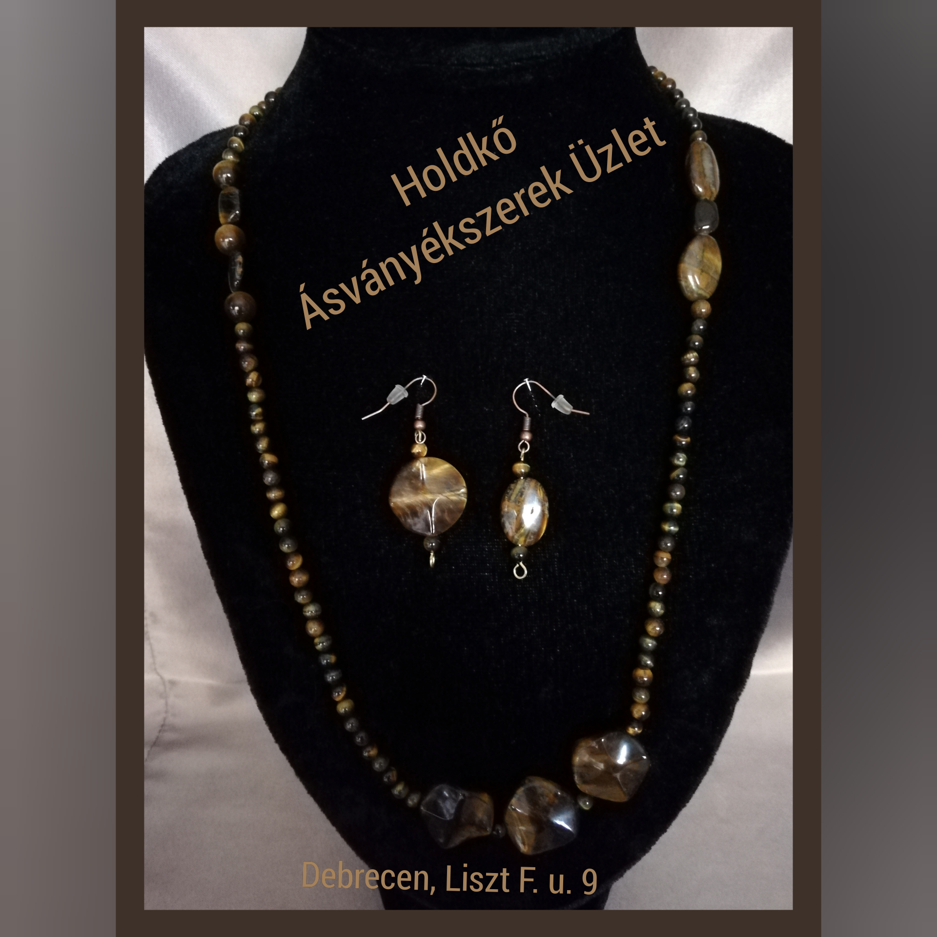A nyaklánc különböző méretű és formájú ( golyó, ovális) tigrisszemből készült, 74 cm hosszú. A fülbevaló asszimetrikus, két különböző formából készült. A szett darabonként is megvásárolható.
