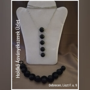 Egyedi készítésű , 21 cm hosszú karkötő fekete gyönggyel. 48 cm hosszú, 5 db lávakőből készült a nyaklánc. A szett darabonként is megvásárolható.