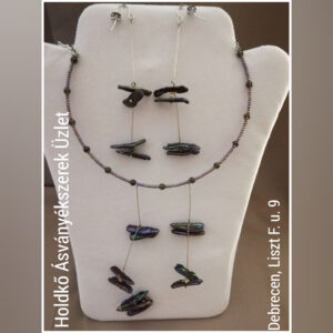 Kék- zöld színű, tenyésztett kagylógyöngy nyaklánc és 9 cmhosszú fülbevaló. A szett darabonként is megvásárolható.